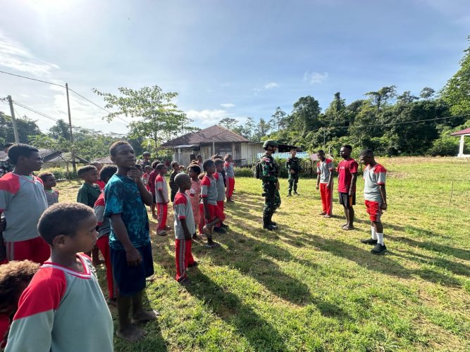 Papuanewsonline.com, Teluk Bintuni - Satgas Pamtas Kewilayahan Yonif 642/Kps Pos Masyeta personil pos memberikan latihan baris berbaris kepada siswa SD Inpres Masyeta, distrik Masyeta, Kabupaten Teluk Bintuni, Papua Barat. (8/4/2025).