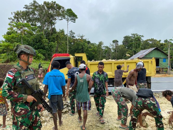 Bantu penyiapan material pembangunan merupakan salah satu bentuk kepedulian satgas terhadap kesulitan yang dihadapi masyarakat