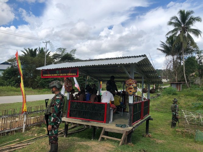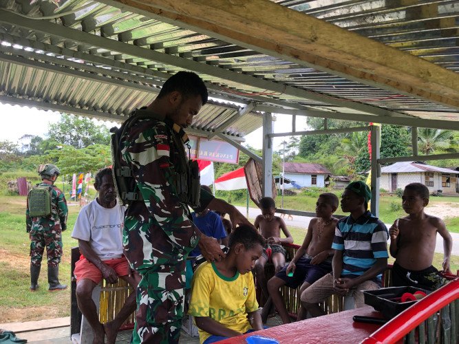 Satgas Yonif 762/VYS Berikan Pelayanan Cukur Rambut Gratis