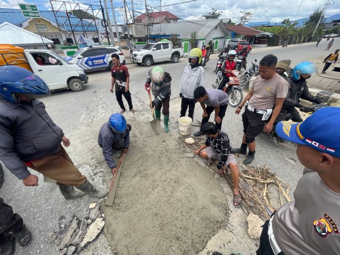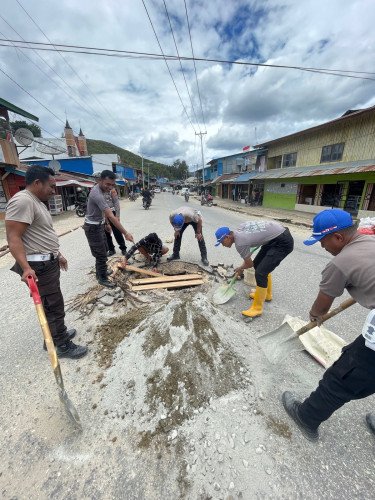 Satlantas Polres Paniai Bergotong Royong Perbaiki Jalan Yang Berlubang Demi Kelancaran Lalulintas