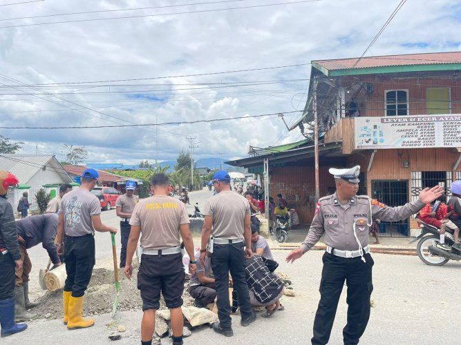 Papuanewsonline.com, Paniai - Kepolisian Negara Republik Indonesia, khususnya Polres Paniai, terus berupaya menjadikan masyarakat lebih aman dan nyaman dalam beraktivitas. Salah satu langkah yang diambil adalah melalui inisiatif Satuan Lalu Lintas (Satlantas) Polres Paniai, yang tidak hanya melakukan pengaturan arus lalu lintas, tetapi juga turut serta dalam kegiatan gotong royong memperbaiki lubang jalan rusak.