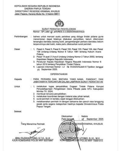 Berdasarkan data dan himpunan informasi Papuanewsonline.com di Polda Papua Tengah, Senin 23 Maret terungkap, terkait skandal penyalagunaan puluhan miliar keuangan dana hiba KPU Mimika, Polda Papua Tengah melalui Direktorat Reserse Kriminal Khusus (Ditreskrimsus) resmi menerbitkan Surat Perintah Penyelidikan pada September 2025.