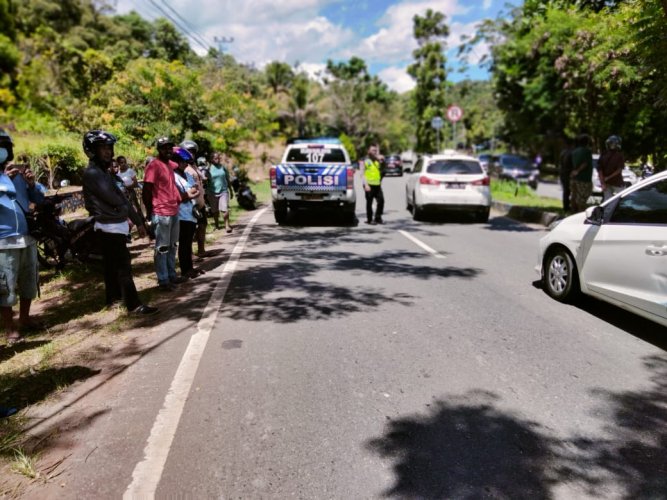 Papuanewsonline.com, Jayapura – Kasus kecelakaan tunggal yang mengakibatkan pengendara sepeda motor meninggal dunia terjadi di Jalan Raya Sentani - Abepura lebih tepatnya di Cemara Kampung Asei Kecil Sentani Timur Kabupaten Jayapura, Minggu (22/10/2023) siang.