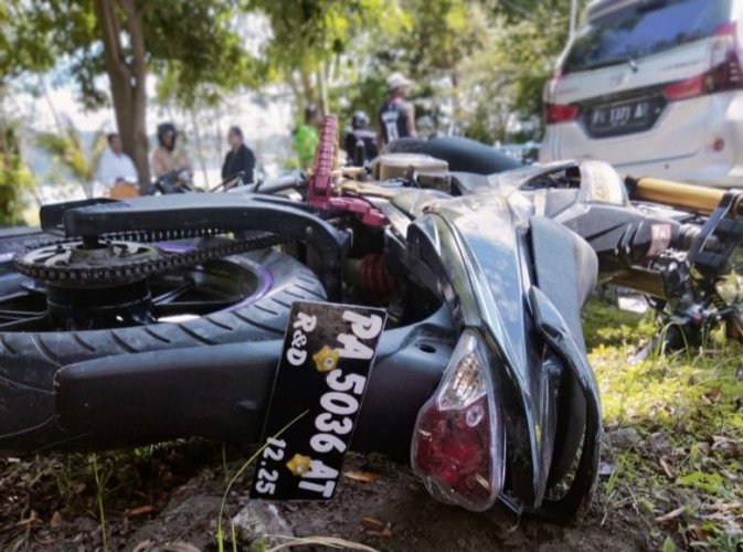 DM (31) meregang nyawa setelah motor Satria FU PA 5036 AT yang dikendarainya tidak bisa dikendalikan akibat kecepatan tinggi sehingga menabrak pembatas jalan yang membuat korban atau pengendara terpental mengenai pohon yang berada di tengan pembatas jalan.
