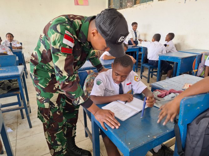 Papuanewsonline.com, Jayawijaya - Menanamkan semangat belajar, Personel Pos Napua Satgas Yonif 641/Bru memberikan materi pembelajaran dalam membangun rasa kebersamaan dan kepedulian terhadap siswa dan siswi SMP Negeri 1 Wamena yang berada di Jl.SD Percobaan, Wamena kota, Distrik Wamena, Kabupaten Jayawijaya, Papua Pegunungan, (17/03/2025)