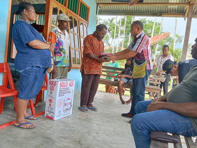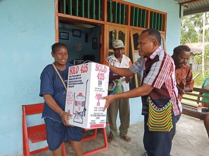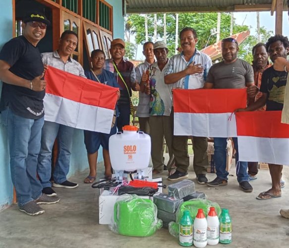 Ipda Edyson Patty memberikan bantuan secara simbolis berupa alat semprot, obat-obatan, dan polybag, yang merupakan bentuk perhatian Polri lewat Polda Papua kepada para petani setempat.