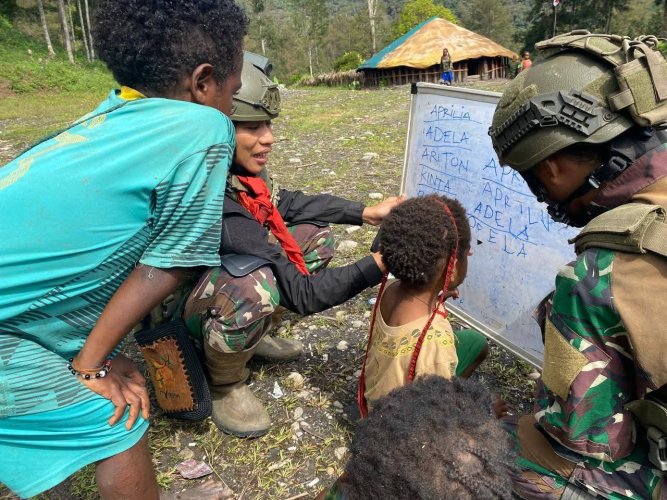 Melalui pendekatan itu, anak-anak terlihat antusias mengikuti pelajaran, sementara para prajurit dengan sabar menjelaskan huruf dan angka satu per satu. Suasana belajar yang hangat dan penuh perhatian membuat para siswa merasa nyaman dan berani mencoba hal baru.
