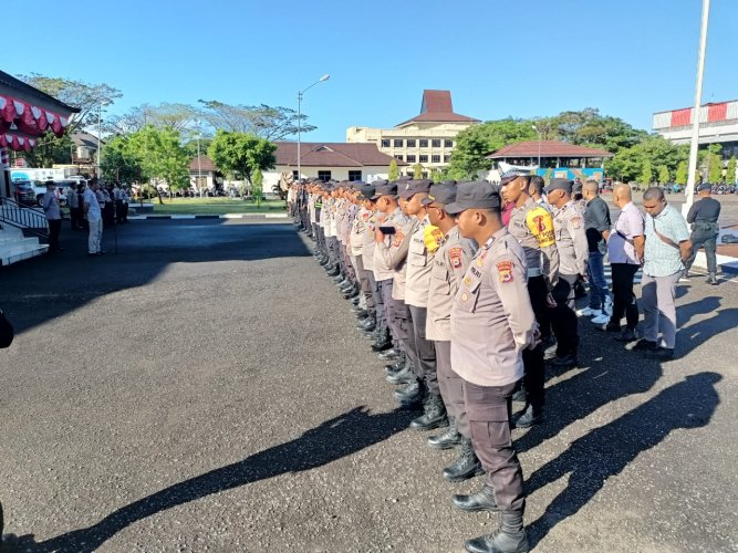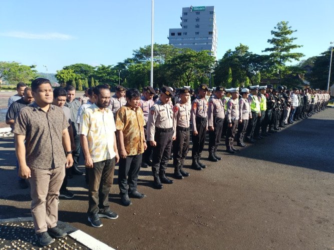 Apel pagi untuk pelaksanaan tugas personel pengamanan Pemilihan Umum (Pemilu) 2024 ini dilaksanakan di lapangan Letkol Pol Chr Tahapary, Kota Ambon, Jumat (3/11/2023).