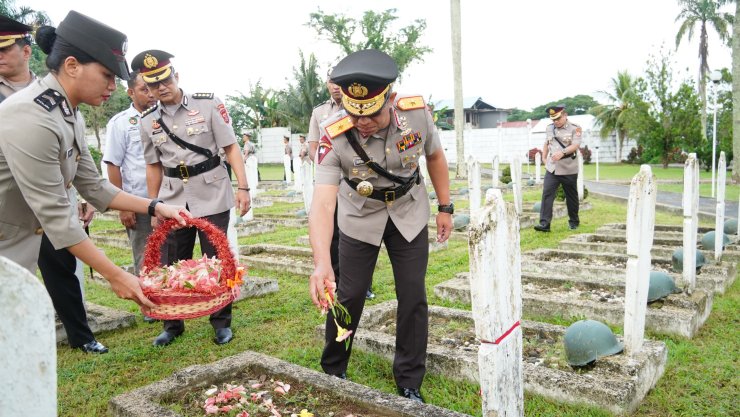 Papuanewsonline.com, Ambon - Menjelang Peringatan Hari Ulang Tahun (HUT) ke-78 Bhayangkara, Kepolisian Daerah Maluku melakukan ziarah dan tabur bunga di Taman Makam Pahlawan (TMP) Kapahaha, Kota Ambon, Senin (24/6/2024).