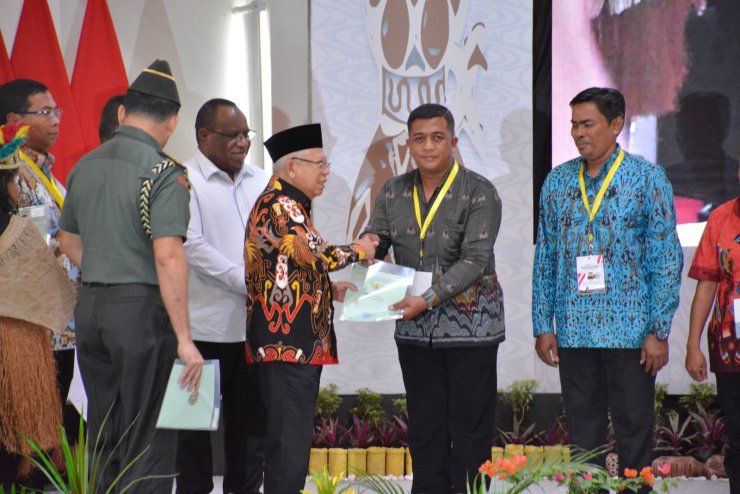 Pada akhir acara, Wakil Presiden Prof. Dr. (H.C.) K.H. Ma’ruf Amin menyerahkan sertifikat PTSL kepada sepuluh perwakilan penerima, yang meliputi berbagai lapisan masyarakat di Papua, sebagai bentuk nyata dari upaya pemerintah untuk mewujudkan keadilan dan kesejahteraan di tanah Papua.PNO-11