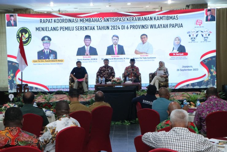 Rapat ini juga mencakup paparan dari para narasumber, yang membahas berbagai aspek terkait pemilu di Papua, termasuk masalah netralitas ASN, anggaran pemilu, identifikasi kerawanan, dan pengamanan serta distribusi logistik pemilu.