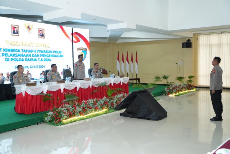 Papuanewsonline.com, Jayapura – Wakapolda Papua, Brigjen Pol. Patrige R. Renwarin, S.H., M.Si., didampingi Irwil II Itwasum Polri, Brigjen Pol. Drs. Sjamsul Sidiq, M.H., memimpin kegiatan Taklimat Awal Audit Kinerja Itwasum Polri Tahap II T.A. 2024, yang berfokus pada Aspek Pelaksanaan dan Pengendalian di Polda Papua. Kegiatan ini berlangsung di Lapangan Rastra Samara SPN Polda Papua, Senin (22/7).