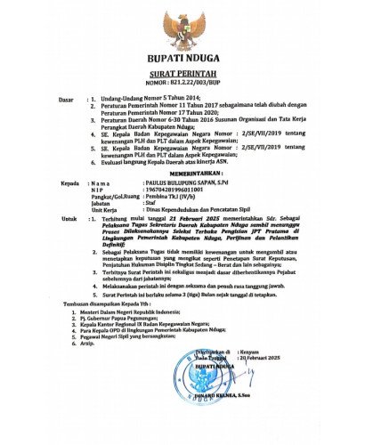 Sebagaimana lampiran surat keputusan (SK) yang diterimah Media ini, Rabu (26/2/2025) ditemukan SK tersebut ditanda tangani Bupati Dinar Kelnea tertanggal 20 Februari 2025 yang mengangkat Paulus Bulupung Sapan dengan pangkat dan golongan pembina Tk.1 (IV/b) Staf pada Dinas Kependudukan dan Catatan Sipil Kabupaten Nduga sebagai Plt Sekda.