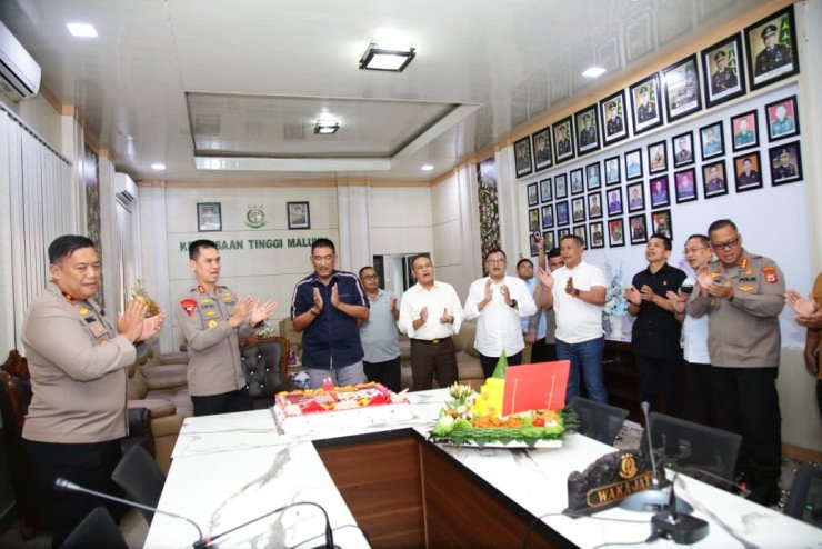 Papuanewsonline.com, Ambon - Kapolda Maluku Irjen Pol. Prof. Dr. Dadang Hartanto, S.H., S.I.K., M.Si yang didampingi Wakapolda Maluku Brigjen Pol. Imam Thobroni S.I.K., M.H, menyampaikan ucapan selamat Hari Ulang Tahun (HUT) ke-80 kepada Kejaksaan Republik Indonesia.Ucapan tersebut disampaikan langsung saat Kapolda dan Wakapolda bersama Para Pejabat Utama Polda Maluku mengunjungi Kejaksaan Tinggi Maluku pada momen peringatan hari lahir Kejaksaan RI, Selasa (2/9/2025).Kedatangan Kapolda dan rombongan disambut hangat oleh Kepala Kejati Maluku, Agoes S. P. S.H., M.H yang didampingi Para Asistennya."Kami menyampaikan selamat memperingati HUT Kejaksaan yang ke-80," ucap Kapolda dalam pertemuan yang berlangsung di ruang kerja Kajati Maluku.Kedatangan Kapolda Maluku pada hari lahir Kejaksaan RI merupakan bentuk sinergitas dan soliditas antara sesama aparat penegak hukum, khususnya di Maluku.Pertemuan yang berlangsung dalam suasana akrab dan penuh kehangatan, menandai sinergi kelembagaan yang begitu kuat.Kapolda menegaskan pentingnya kebersamaan antar-institusi penegak hukum, khususnya dalam menjaga keadilan dan kepastian hukum bagi masyarakat.Kolaborasi yang solid antara Kepolisian dan Kejaksaan akan menjadi benteng kuat dalam memberikan rasa aman, serta mengawal pembangunan di daerah agar berjalan dengan baik tanpa gangguan hukum maupun keamanan.Kunjungan Kapolda disambut dengan penuh antusias oleh Kajati Maluku bersama para asistennya. "Kami menyampaikan terima kasih dan apresiasi kepada Bapak Kapolda dan Para Pejabat Utama Polda yang hadir dalam peringatan HUT Kejaksaan hari ini," ucap Kajati.Pada momen tersebut, Kajati juga memberikan potongan kue ulang tahun kepada Kapolda Maluku sebagai bentuk simbol untuk memperkuat kerjasama sama antara Polda Maluku dan Kejaksaan tinggi Maluku. PNO-12