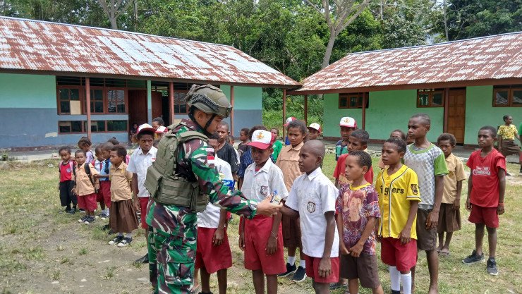 Papuanewsonline.com, Keerom – Dalam rangka tingkatkan semangat belajar anak-anak di perbatasan, Satgas Yonif 131/BRS melaksanakan kegiatan anjangsana sekaligus membagikan buku tulis untuk belajar kepada adik-adik di SD YPPK Kenandega, Kp. Banda Distrik Waris, Kab. Kerom, Provinsi Papua, Rabu (16/10/2024).Danpos Waris Lettu Inf Yudha menyampaikan, kegiatan positif ini diharapkan dapat memberikan dampak yang positif juga terutama saat pemberian buku tulis kepada anak-anak sekolah, semoga hal tersebut dapat meningkatkan semangat belajar mereka.Sementara itu Bapak Elius (45 tahun), salah satu guru di SD YPPK Kenandega, mengucapkan terima kasih atas kehadiran dan kontribusi Satgas Yonif 131/BRS, dengan adanya dukungan ini, Siswa-siswi kami merasa lebih termotivasi dan semangat dalam belajar. PNO-12