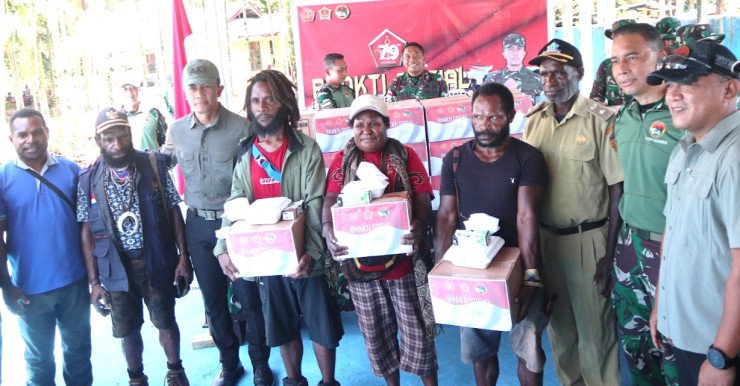 Papuanewsonline.com, Mimika – Peringatan Hari Ulang Tahun (HUT) ke-79 Tentara Nasional Indonesia (TNI) tahun 2024 memiliki tema “TNI Modern Bersama Rakyat Siap Mengawal Suksesi Kepemimpinan Nasional Untuk Indonesia Maju,” disampaikan langsung Panglima Komando Gabungan Wilayah Pertahanan III (Kogabwilhan III), Letnan Jenderal TNI Bambang Trisnohadi, dalam sambutannya mengawali acara Bhakti Sosial (Baksos) HUT ke-79 TNI di Kampung Damai, Distrik Kwamki Narama, Kabupaten Mimika, Provinsi Papua Tengah. Momentum Baksos ini diwujudkan dalam bentuk pelayanan kesehatan, makan siang gratis dan pembagian Sembako oleh para Prajurit Komando Operasi (Koops) HABEMA kepada para warga pada hari Selasa pagi, (1/10/2024), di lingkungan kantor Kepala Kampung Damai.Sejak pagi hari, warga Kampung Damai berduyun-duyun mendatangi lokasi acara Baksos yang untuk pertama kalinya diselenggarakan oleh TNI di wilayah Distrik Kwamki Narama. Lebih dari 200an orang masyarakat yang turut serta meramaikan jalannya acara Baksos TNI. Situasi aman dan kondusif mendukung gegap gempita para warga yang beramai-ramai menghadiri acara Baksos TNI tersebut. Tepat pada pukul 09.00 WIT, acara diawali dengan serangkaian doa dan sambutan, termasuk oleh Kepala Kampung Damai atas nama Bapak Lutter Wonda serta sambutan Panglima Kogabwilhan III. Lebih lanjut, juga dilaksanakan penyerahan bantuan alat musik dan alat olahraga oleh Panglima Kogabwilhan III, Letjen TNI Bambang Trisnohadi, dan Panglima Koops HABEMA, Brigjen TNI Lucky Avianto, kepada para warga Kampung Damai, yang diwakili oleh Kepala Kampung Damai.Dalam sambutannya, Bapak Lutter Wonda menyampaikan apresiasinya kepada TNI yang telah memperhatikan warga Kampung Damai, melalui pelaksanaan Bhakti Sosial. "Tuhan senantiasa melindungi dan memberkati Bapak-Bapak TNI,"ungkapnya.Ungkapan terima kasih tersebut juga disampaikan oleh para warga yang berkesempatan mengikuti seluruh rangkaian acara, termasuk pelayanan kesehatan, makan siang gratis dan pembagian Sembako. Salah satu diantaranya, terdapat Mama Ria Waker, yang berterima kasih atas kepedulian TNI dengan memberikan bantuan Sembako dan layanan kesehatan gratis.“Puji Tuhan, saya menerima bantuan hari ini. Saya merasa lebih sehat setelah diperiksa dan diberi obat oleh Pak Dokter TNI. Tuhan memberkati," ucapnya.Menurut Panglima Kogabwilhan III, Letjen TNI Bambang Trisnohadi, rangkaian acara Baksos TNI di Kampung Damai, Distrik Kwamki Narama ini dalam rangka memperingati HUT ke-79 TNI."Hal ini juga merupakan implementasi pelaksanaan tugas TNI sesuai Instruksi Presiden RI Nomor 9 Tahun 2020 tentang Percepatan Pembangunan Kesejahteraan di wilayah Papua, khususnya memberikan bantuan dukungan pelayanan dasar kepada masyarakat setempat,"pungkasnya.Acara Baksos TNI yang dilaksanakan di Kampung Damai telah berlangsung dengan aman dan penuh suasana gembira serta damai, yang menggambarkan terwujudnya pelaksanaan tugas TNI dalam memberikan dukungan pengamanan di wilayah Papua. PNO-12