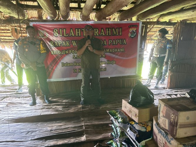 Papuanewsonline.com, Asmat – Dalam rangka Jumat berkah, Wakapolda Papua, Brigjen Pol. DR. Faisal Ramadhani, S.Sos., S.I.K., M.H., melakukan kunjungan serta silaturahmi dengan masyarakat Kampung Syuru, Kampung Kaye, dan Kampung Aswetsy, Distrik Agats, Kabupaten Asmat, Provinsi Papua Selatan, (11/09/2024).Silaturahmi ini berlangsung di JEUW (Rumah Bujang) Kampung Syuru, Distrik Agats Kabupaten Asmat, dan turut didampingi oleh Kapolres Asmat, AKBP Samuel D. Tatiratu, S.I.K., Wakapolres Asmat, Kompol Sutardi, S.H., M.H., Para Pamen Polda Papua, serta Para PJU Polres Asmat.Wakapolda Papua, Brigjen Pol Dr.Faizal Ramadhani, S.Sos., S.I.K., M.H., dalam kesempatannya turut memberikan himbauan kepada masyarakat setempat bahwa kehadirannya disini diawali dengan Kegiatan Festival Asmat Pokman.“Saya sampaikan salam dari Kapolda Papua, Irjen Pol. Patrige Renwarin, dikarenakan beliau tidak bisa hadir kesini, dan memerintahkan Saya untuk menghadiri acara Festival Asmat Pokman disini.,” ujarnya.Wakapolda Papua juga mengucapkan terimakasih atas kerja sama dari masyarakat disini, karena sejauh ini situasi maupun kondisi terbilang aman dan kondusif, dan tentunya Polres Asmat tidak bisa melakukan ini tanpa ada dukungan dari masyarakat.“Terimakasih atas sambutannya, Saya harap untuk kedepannya situasi maupun kondisi di Asmat bisa semakin baik, semakin kondusif, terutama menjelang Pilkada ini, semoga semua yang ada disini bisa mendukung kita, dan mengsukseskan gelaran Pilkada nantinya,” pungkas Brigjen Pol Dr.Faizal Ramadhani.Adapun sambutan dari Kepala Suku Kampung Syuru, Felix Okwom yang menyampaikan banyak terimakasih kepada Wakapolda Papua beserta rombongan karena telah berkunjung dan memberi bantuan berupa sembako kepada masyarakat asli Asmat, yang khususnya berada di Distrik Agats.“Saya mewakili masyarakat Asmat dengan mengatakan bahwa Kampung disini semua dalam keadaan aman, selama ini anggota Polres Asmat bisa bekerja sama dengan masyarakat, dan terimakasih atas kunjungan bapak Wakapolda kesini,” ucapnya. PNO-12