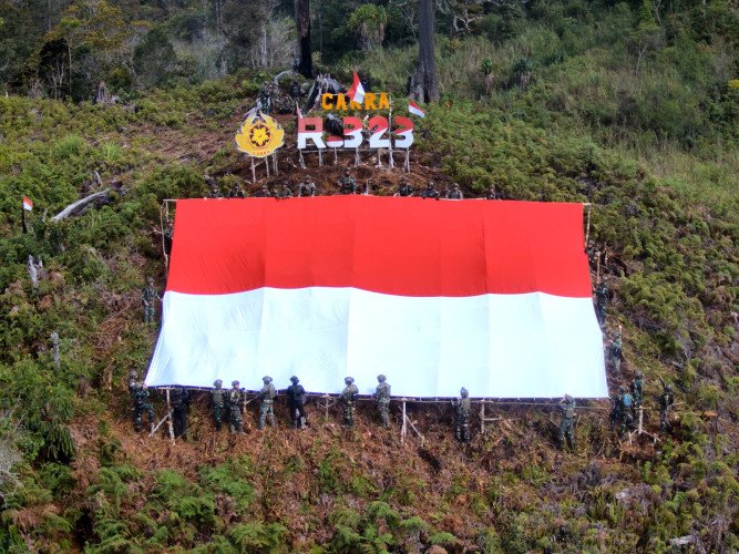 Satgas Yonif 323 Buaya Putih Kibarkan Bendera Raksasa di Bukit Cakra Papua