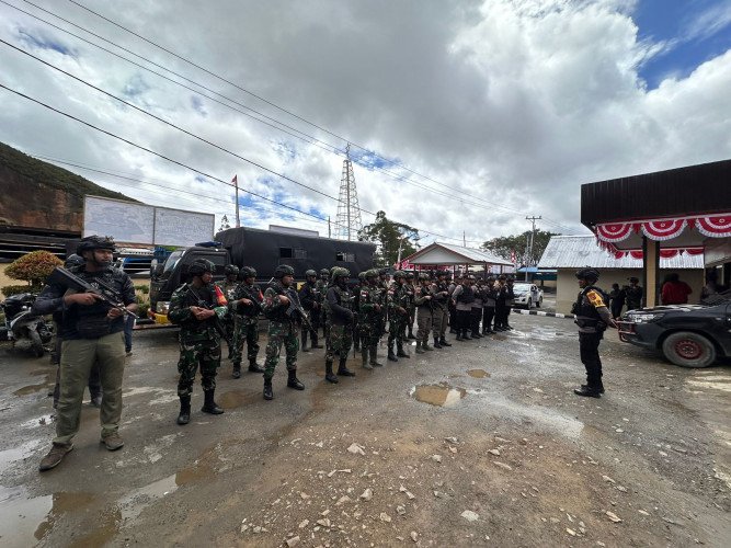Papuanewsonline.com, Jayapura – Dalam rangka menjaga situasi Kamtibmas yang aman dan kondusif setelah beredarnya informasi terkait adanya demo peringatan hari New York Agreement 1962 dan hari Rasisme tanggal 15 Agustus 2024 di Kabupaten Dogiyai, aparat TNI-Polri melaksanakan patroli gabungan, Kamis (15/08/2024).Patroli gabungan ini melibatkan Personil Polres Dogiyai, Personil Brimob Kotis Yon C Nabire, Personil Koramil Moanemani, Personil Satgas 756/WMS dan atgas Gakkum Damai Cartenz.Apel gabungan tersebut dipimpin oleh Wakapolres Dogiyai, AKP Muhammad Tahir yang mewakili Kapolres Dogiyai Kompol Sarraju, S.H.Dalam arahanya, Wakapolres mengatakan bahwa hari ini personel TNI-Polri melaksanakan patroli gabungan dikarenakan hari ini merupakan mereka yang bersebrangan dengan NKRI akan melakukan unjuk rasa di Kabupaten Nabire.“Hari ini kita akan melaksanakan patroli gabungan guna mencegah aksi yang tidak diinginkan dan melakukan penyekatan terhadap masyarkat yang akan turun ke Kabupaten Nabire untuk mengikuti unjuk rasa,” ucap Wakapolres.“Walaupun daerah Dogiyai aman sampai dengan saat ini, tetapi tidak boleh lengah dengan situasi yang ada, karena perkembangan informasi akan cepat menyebar apabila ada kejadian di daerah lain terutama di kabupaten yang berbatasan langsung dengan Kabupaten Dogiyai. Untuk itu kita tidak boleh lengah, kita tetap waspada terhadap segala kemungkinan yang akan terjadi,” imbuhnya. (PNO-12)