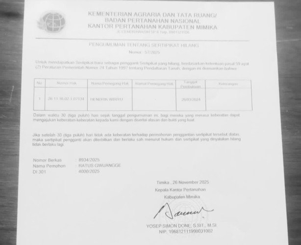Kantor Pertanahan Mimika Terbitkan Pengumuman Resmi Penggantian Sertifikat Hilang Milik Warga