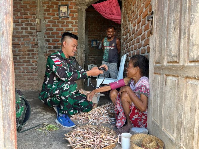 Papuanewsonline.com, Inbate - Wujud nyata kepedulian terhadap kesehatan masyarakat di wilayah perbatasan, Satgas Pamtas RI–RDTL Sektor Barat dari Yonarhanud 15/DBY kembali melaksanakan pelayanan kesehatan langsung ke rumah warga.Pada Senin, 12 Mei 2025, personel Pos Inbate yang dilakukan oleh Kopda M. Imam Jufri selaku Tenaga Kesehatan Pos, bersama rekan-rekannya melakukan pemeriksaan kesehatan di kediaman Bapak Ilyas Metan di Desa Inbate, Kecamatan Bikomi Nilulat, Kabupaten Timor Tengah Utara. Kegiatan ini merupakan bagian dari program layanan kesehatan keliling yang secara rutin dilaksanakan oleh Pos Inbate guna membantu warga yang membutuhkan pemeriksaan dan pengobatan ringan.“Kami senang bisa membantu warga seperti Bapak Ilyas dan Mama Yosefina. Ini adalah bentuk pengabdian kami, tidak hanya menjaga perbatasan, tetapi juga hadir untuk kesejahteraan masyarakat,” ujar Kopda Imam Jufri.Bapak Ilyas Metan menyampaikan rasa terima kasihnya atas perhatian dari Satgas. “Kami sangat senang dengan kehadiran tim kesehatan dari Pos Inbate. Penyakit saya yang sudah lama diderita kini mulai membaik,” ungkapnya haru.Kegiatan ini menjadi bukti bahwa kehadiran Satgas Pamtas RI–RDTL tidak hanya dalam aspek keamanan, tetapi juga sebagai sahabat masyarakat di wilayah perbatasan. PNO-12