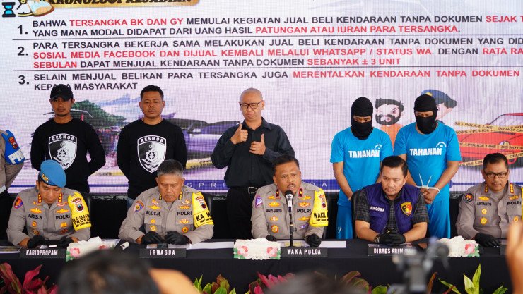 Papuanewsonline.com, Semarang - Polda Jawa Tengah (Jateng) mengungkap kasus tindak pidana penadahan kendaraan di wilayah Sukoharjo. Dari pengungkapan ini, telah dilakukan penangkapan dan penahanan tersangka BK (52) dan GY (43).Wakapolda Jateng Brigjen. Pol. Agus Suryonugroho menjelaskan, pengungkapan ini dimulai dari adanya laporan masyarakat pada Juli 2024 lalu. Kemudian, penyidik melakukan pendalaman dan mendapatkan bukti-bukti bahwa tersangka kerap menjadi penadah dari kendaraan tanpa dokumen lengkap.“Saat dilakukan penangkapan kepada tersangka, penyidik menemukan 19 kendaraan roda empat berbagai merk, 10 STNK, dan empat ponsel,” ungkap Wakapolda dalam konferensi pers, Kamis (29/8/24).Ia menerangkan, saat dilakukan pemeriksaan kepada tersangka, keduanya mengaku menjadi penadah karena keuntungan yang didapat cukup besar. Keduanya pun menjual kendaraan hasil kejahatan itu melalui media sosial dan Whatsapp.“Rata-rata dalam sebulan, para tersangka ini menjual tiga unit kendaraan,” jelas Wakapolda.Ditambahkan Wakapolda, para tersangka tidak hanya menjual kendaraan-kendaraan tersebut, tetapi juga merentalkannya dengan berbagai nominal.“Jadi kendaraan ini rata-rata masih kredit, lalu dioper dan akhirnya dijual tanpa dokumen yang lengkap. Nanti kita dalami lagi keterlibatan lainnya,” ujar Wakapolda.Atas perbuatannya, para tersangka dijerat pasal 481 KUHP dan/atau pasal480 jo pasal 55 KUHP dan/atau pasal 56 KUHP Dengan ancaman hukuman 7 tahun penjara. (PNO-12)