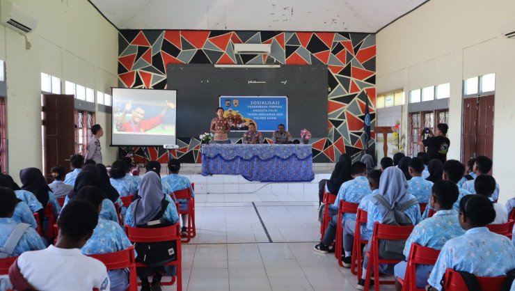 Papuanewsonline.com, Sarmi – Polri kembali membuka kesempatan bagi pemuda pemudi terbaik untuk bergabung dan mengabdikan diri kepada bangsa dan negara melalui Kepolisian. Penerimaan Polri 2025 jalur Bintara dan Taruna Akademi Polisi (Akpol) ini untuk memenuhi kebutuhan organisasi Polri melalui penambahan kekuatan personil. Untuk itu, Bagian Sumber Daya Manusia (SDM) Polres Sarmi (Polda Papua) melakukan sosialisasi Penerimaan Polri Terpadu Tahun Anggaran 2025 di SMA Negeri 1 Sarmi, Kamis (30/01/2025)Dikonfirmasi terkait sosialisasi tersebut, Kapolres Sarmi Kompol Suparmin, S.IP.,M.H., melalui Paur Min Bag SDM Polres Sarmi Bripka Sukardi, menjelaskan Pendaftaran Bintara dan Akpol 2025 bisa dilakukan secara online melalui laman resmi penerimaan polri.“Bagi siswa siswi kelas 12 yang berminat menjadi anggota Polri, dapat menyiapkan berkas persyaratan yang dibutuhkan dari sekarang,” ujar Bripka SukardiBripka Sukardi menegaskan, semua proses seleksi mulai dari pendaftaran hingga pengumuman terakhir tidak dipungut biaya sama sekali alias gratis.“Jadi, jangan mudah percaya jika ada yang menawarkan bisa meluluskan dengan imbalan tertentu, semua proses dilakukan secara terbuka,” ucapnya.Untuk tata cara pendaftaran online, penerimaan Polri calon Bintara dan Taruna Akpol 2025 Pendaftar dapat membuka website penerimaan anggota Polri dengan alamat website : https//penerimaan.polri.go.id., UjarnyaIa menambahkan, sosialisasi ini menjadi langkah positif dalam mendekatkan Polri dengan masyarakat, khususnya generasi muda yang berpotensi menjadi anggota Polri di masa depan nantinya.Dengan pemahaman yang lebih baik tentang rekrutmen Polri, diharapkan calon anggota Polri akan semakin siap menghadapi tahapan seleksi dan mampu berkontribusi positif dalam menjaga keamanan dan ketertiban masyarakat.Sementara itu, Kepala Sekolah SMAN 1 Sarmi Bapak Eli, M,e,d Mapling, sangat mengapresiasi kegiatan sosialisasi Penerimaan Calon anggota Polri di sekolahnya.“Semoga anak didik kami ada yang menjadi anggota Polri nantinya,” pungkasnya. PNO-12