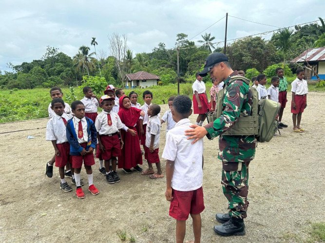 Papuanewsonline.com, Keerom - Dalam Upaya Membantu proses belajar mengajar di wilayah perbatasan, Personel Pos Yamara Satgas Pamtas RI-PNG Yonif 131/BRS dipimpin oleh Serda Arya membantu mengajar di SDN Inpres Pir V Arso Keerom, kampung Yamara distrik Arso Timur Kab.Kerom, Papua, Jum'at (01/11/2024).Dalam kegiatan yang dilaksanakan oleh personel Pos Yamara ini meliputi kegiatan latihan baris berbaris, Senam SKJ dan jalan sehat. Selain itu, mereka menyediakan makanan tambahan ekstra puding seperti bubur kacang ijo dan Ketan hitam kepada siswa SD inpres Pir V untuk mendukung kesehatan dan menambah energi siswa agar lebih fokus dalam mengikuti pelajaran.Dengan adanya program ini, diharapkan tercipta hubungan yang lebih erat antara TNI dan masyarakat lokal. Program pemberdayaan pendidikan dan kesehatan seperti ini juga akan dilanjutkan secara berkelanjutan di wilayah-wilayah penugasan lainnya, sebagai bagian dari upaya TNI dalam mendukung terciptanya generasi muda Papua yang sehat, cerdas, dan berkarakter.Sementara itu, Bapak Ricardo selaku guru di SD Inpres Pir V mengucapkan terimakasih kepada Pos Yamara yang memberikan bantuan mengajar di sekolahnya, kami berharap dengan adanya kegiatan Gadik ini akan membangkitkan motivasi serta semangat para siswa untuk belajar sesuai dengan kurikulum pendidikan ini,” ujar guru SD Inpres Pir V Bpk. Ricardo. PNO-12