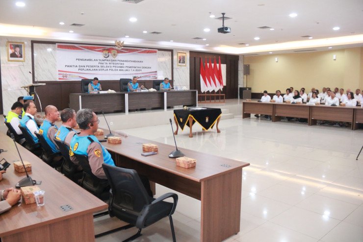 Papuanewsonline.com, Ambon - Biro Sumber Daya Manusia (SDM) Polda Maluku menggelar kegiatan pengambilan sumpah dan penandatanganan pakta integritas yang diikuti oleh 43 peserta seleksi Pegawai Pemerintah dengan Perjanjian Kerja (PPPK).Kegiatan yang dilaksanakan di ruang rapat utama Markas Polda Maluku, Senin (28/10/2024), ini dipimpin oleh Karo SDM Polda Maluku Kombes Pol Agus Nugroho S.IK., M.H. Ia didampingi Kabid Dokkes dan Kepala SPN Polda Maluku."Saya mengajak peserta seleksi agar bersyukur karena bisa ikut dalam seleksi PPPK, karena kita tau bersama bahwa tidak semua juga bisa ikut seleksi ini," ajak Karo SDM Polda Maluku Kombes Agus Nugroho dalam sambutannya.Kombes Agus mengingatkan para peserta untuk mempersiapkan diri menghadapi seleksi PPPK Tahun 2024. "Saya minta seluruh peserta agar setelah ini belajar lagi, di latih lagi sebelum rekan-rekan mengikuti ujian nanti sehingga saya harapkan rekan-rekan bisa lulus dengan baik," pintanya.Kepada panitia seleksi Kombes Agus juga meminta untuk menjalankan tugas dengan baik dan benar. "Saya minta kepada panitia agar dapat melaksanakan tugasnya dengan baik sesuai tupoksinya sehingga proses seleksi PPPK dapat berjalan dengan baik dan lancar," harapnya.Untuk diketahui, sebanyak 43 peserta seleksi PPPK berasal dari satuan kerja yang ada pada Polda Maluku dan Polres jajaran. PNO-12