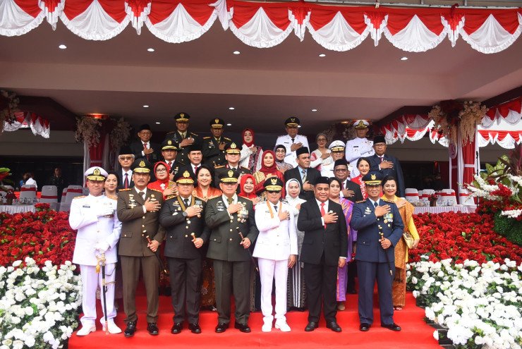 Papuanewsonline.com, Ambon - Kepala Kepolisian Daerah Maluku Irjen Pol Drs. Eddy Sumitro Tambunan, M.Si menghadiri upacara peringatan detik-detik proklamasi kemerdekaan RI ke-79.Upacara pengibaran bendera merah putih yang digelar Pemerintah Provinsi Maluku ini dilaksanakan di Lapangan Merdeka, Kota Ambon, Sabtu (17/8/2024). Turut hadir Forkopimda Maluku.Bertindak sebagai inspektur upacara Penjabat Gubernur Maluku. Sementara selaku Komandan Upacara yaitu Letkol Julius Matakena, Danyon 733_Masariku. Sedangkan perwira upacara yaitu Mayor M. Arif Yanto, Paban Binkar spers Kodam XV Pattimura.Menurut Kapolda Maluku, seluruh masyarakat bangsa Indonesia sementara ini tengah bersukacita melaksanakan upacara peringatan Hari Ulang Tahun (HUT) RI ke 79.Tema HUT Proklamasi tahun ini yaitu “Nusantara baru Indonesia maju”. Kapolda berharap tema ini dapat meningkatkan semangat baru masyarakat untuk membangun bangsa Indonesia yang lebih maju, khususnya di tanah Maluku."Pada momen kemerdekaan ini, Saya juga mengajak seluruh masyarakat untuk bersatupadu menjaga situasi kamtibmas agar selalu kondusif menghadapi Pilkada ke depan," ajaknya.Kapolda juga mengajak personel Polri untuk terus melaksanakan tugas dan pengabdian terbaik kepada masyarakat bangsa dan negara."Saya menghimbau kepada seluruh personil untuk terus bekerja dengan sungguh-sungguh, ikhlas dan penuh tanggung jawab, dan Polri juga harus mampu mendukung agenda-agenda dan program pemerintah ke depan dalam menghadapi Pilkada 2024," katanya. (PNO-12)