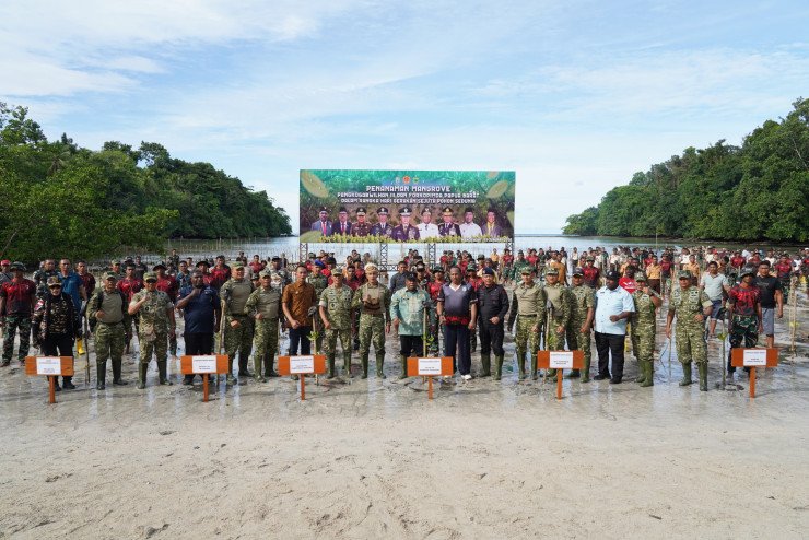 Papuanewsonline.com, Manokwari Utara – Dalam rangka memperingati Hari Gerakan Sejuta Pohon Sedunia, Pangkogabwilhan III Letjen TNI Bambang Trisnohadi, S.I.P., bersama Pangdam XVIII/Kasuari Mayjen TNI Christian Kurnianto Tehuteru serta unsur Forkopimda Papua Barat melaksanakan penanaman 1.500 pohon mangrove di Pantai Saubeba, Distrik Manokwari Utara, Papua Barat, Jumat (09/01/2026).Dalam kegiatan tersebut, Pangkogabwilhan III, Pangdam XVIII/Kasuari, serta unsur Forkopimda Papua Barat, memberikan tali asih kepada masyarakat setempat. sebagai bentuk kepedulian sosial dan upaya mempererat kemanunggalan TNI dengan rakyat.Pangkogabwilhan III menyampaikan bahwa penanaman mangrove bertujuan untuk menjaga kelestarian ekosistem, khususnya di Papua Barat yang memiliki garis pantai luas dan potensi mangrove yang besar. Mangrove berperan penting dalam mencegah abrasi serta menjadi habitat biota laut yang bermanfaat bagi masyarakat. Selanjutnya kegiatan penanaman mangrove dilakukan oleh seluruh peserta kegiatan Hari Gerakan Sejuta Pohon Sedunia. PNO-12