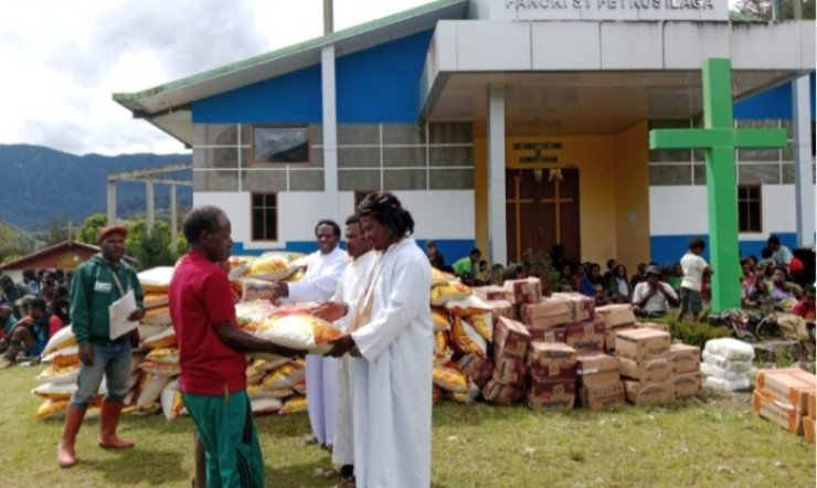 Papuanewsonline.com, Timika– Intensitas Peperangan TNI/Polri Vs TPNPB/OPM berakibat warga sipil kehilangan nyawa dan harta benda, bahkan warga sipil harus meninggalkan rumah dan kampung, mereka mengungsi untuk mencari tempat aman.Atas krisis kemanusian ini, Keuskupan Timika menyalurkan bantuan kemanusiaan berupa 2 ton bahan makanan (Bama) kepada warga pengungsi dan umat Paroki Santo Petrus Ilaga, di Kabupaten Puncak, Papua Tengah.Bantuan ini disalurkan Keuskupan Timkma kepada warga pengungsi, yang terdampak konflik bersenjata di Kabupaten Puncak.Bantuan dari Keuskupan Timika itu dikirim dengan pesawat AMA dari Timika ke Ilaga pada Jumat, 30 Mei 2025.Diketahui Konflik bersenjata di Kabupaten Puncak melebar ke beberapa distrik diantaranya Distrik Gome dan Distrik Gome Utara.Sesuai data yang diterimah Keuskupan Timika bahwa akibat dari konflik bersenjata yang berkepanjangan ini menyebabkan 13.735 warga mengungsi dan menghadapi kesulitan dalam memenuhi kebutuhan pokok.Atas situasi ini, Keuskupan Timika menginisiasi pengiriman bantuan yang langsung disalurkan oleh Pastor Paroki Santo Petrus Ilaga, Febronius Angelo, bersama beberapa akolit, kepada para pengungsi di wilayah Distrik Gome, Kabupaten Puncak.Pastor Febronius melalui keterangan tertulis yang diterimah Media ini, Minggu 1 Juni mengatakan saat ini warga pengungsi berada di tujuh titik yaitu di Kompleks Gereja Katolik Gome, Kompleks Gereja Katolik Gome Atas, dua posko di Wilayah Jenggernop, di jalan Moko, Distrik Ilaga, dan di Distrik Kimak. " Pembagian Bama disesuaikan dengan banyaknya jumlah pengungsi," ucap Romo Febronius.Pastor Febronius juga mengucapkan terima kasih kepada pimpinan Keuskupan Timika dan semua pihak yang telah membantu umat Katolik yang senentara saat ini berada di tempat pengungsian.Sementara itu Perwakilan Keuskupan Timika Beni Meo, menjelaskan rincian bahan makanan yang dikirimkan dalam misi kemanusiaan ini, yaitu: Beras: 2 ton, Mi instan (Supermi): 40 karton, Minyak goreng: 20 karton, Garam: 4 ball, Ikan asin: 25 kg dan Ikan beku: 20 kg.“ Bantuan ini merupakan bentuk nyata solidaritas Gereja Katolik kepada umat dan masyarakat yang sedang berada dalam situasi sulit, Kami berharap bantuan ini bisa meringankan beban mereka dan menunjukkan bahwa mereka tidak sendiri,” ujar Beni Meo.Beni menjelaskan, Pengiriman bantuan tersebut dilakukan melalui jalur udara, dari bandara Mozes Kilangin Mimika ke Bandara Ilaga Kabupaten Puncak." Bantuan ini didistribusikan kepada para pengungsi yang berada di bawah koordinasi Paroki Santo Petrus Ilaga," jelasnya.Diakhir penyampaianya, Beni atas nama Keuskupan Timika menyampaikan apresiasi kepada semua pihak yang telah mendukung umat Katolik yang nengungsi di Kabupaten Puncak.Beni mengatakan, Keuskupan Timika menyampaikan apresiasi dan terimakasih kepada semua pihak yang turut meringkankan beban umat Katolik yang berada di tempat pengungsian di Ilaga." Kami berharap keamanan di wilayah Papua Tengah dapat segera pulih, sehingga warga masyarakat dan umat bisa kembali hidup dengan aman dan bermartabat," pungkasnya.(Sumber: Kuskupan Timika)