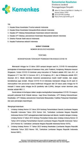 Papuanewsonline.com, Jakarta – Kementerian Kesehatan (Kemenkes) Republik Indonesia mengeluarkan Surat Edaran (SE) Nomor SR.03.01/C/1422/2025 pada Sabtu, 28 Mei 2025, sebagai langkah antisipasi terhadap peningkatan kasus Covid-19 di beberapa negara Asia. Kemenkes mengeluarkan status waspada Meskipun Indonesia sendiri menunjukkan tren penurunan kasus konfirmasi mingguan, dengan hanya 3 kasus pada minggu ke-20 (positivity rate 0,59%) dan varian dominan MB.1.1.Peningkatan kasus dilaporkan terjadi di Thailand, Hongkong, Malaysia, dan Singapura. Varian dominan yang terdeteksi di masing-masing negara antara lain XEC dan JN.1 (Thailand), LF.7 dan NB.1.8 (Singapura), JN.1 (Hongkong), serta XEC (Malaysia). Meskipun tingkat penularan dan angka kematian masih relatif rendah, Kemenkes menganggap perlu untuk meningkatkan kewaspadaan mengingat pengalaman di masa lalu. Surat edaran ini ditujukan kepada Dinas Kesehatan Provinsi dan Kabupaten/Kota, UPT Bidang Kekarantinaan Kesehatan, UPT Bidang Laboratorium Kesehatan Masyarakat, rumah sakit, puskesmas, dan seluruh fasilitas pelayanan kesehatan di Indonesia. SE tersebut berisi imbauan untuk meningkatkan kewaspadaan terhadap Covid-19 dan penyakit menular lainnya yang berpotensi menimbulkan kejadian luar biasa (KLB) atau wabah.Kemenkes menghimbau masyarakat untuk tetap waspada dan menerapkan protokol kesehatan, meskipun kasus di Indonesia saat ini terkendali. Langkah-langkah pencegahan seperti menjaga kebersihan, memakai masker di tempat umum, dan menjaga jarak fisik masih sangat dianjurkan. ( Jidan )