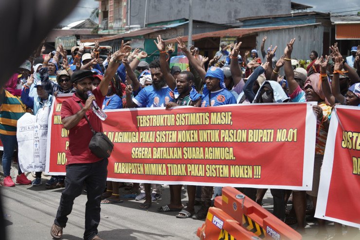 Papuanewsonline.com, Timika- Masyatakat adat Amungme beserta ribuan Pendukung pasangan calon bupati dan wakil bupati Mimika nomor urut 3, Alexander Omaleng-Yusuf Rombe (AIYE) menggeruduk kantor Komisi Pemilihan Umum Daerah (KPUD) Mimika, Rabu (11/12/2024).Masyarakat adat ini menuntut suara mereka di Kuamki Narama, Tembaga Pura dan Kuala Kencana serta di Distrik Jila dikembalikan.Ketua Tim Pemenangan AIYE, Nalio Jangkup dalam orasinya mengatakan, Mimika tidak berlaku sistem noken." Tidak ada sistem bungkus di Kabupaten Mimika. Ini pelanggaran fatal. AIYE menang di mana-mana tapi semua suara masyarakat dicuri," ujar Nalio.Ia mengatakan, hak Orang Asli Papua (OAP) tidak boleh dirampas oleh orang dari luar."Kami OAP juga bisa memimpin negeri kami sendiri. Kami juga tahu aturan. Jangan ada pencuri di Mimika," katanya.Nalio menegaskan bahwa sistem noken tidak berlaku di Mimika, dan adanya dugaan manipulasi suara merupakan pelanggaran berat. Menurutnya, suara pasangan AIYE telah dicuri di distrik Tembagapura, Kuala Kencana, Kwamki Narama, dan Jila.Isu ini juga membawa perhatian pada hak Orang Asli Papua (OAP) dalam memimpin daerahnya. Nalio menilai hak-hak OAP telah dirampas oleh pihak-pihak dari luar.“Kami, OAP, juga bisa memimpin negeri kami sendiri. Hak kesulungan kami tidak boleh dijual,” katanya.“Segera kembalikan suara nomor urut 3 pada Distrik Tembagapura, Kuala Kencana, dan Kwamki Narama," ucap Nalio.Nalio menegaskan bahwa pihaknya akan menempuh langkah-langkah hukum sesuai mekanisme yang berlaku jika tuntutan tidak direspons.“ Ada indikasi kuat intervensi dari penyelenggara untuk mengalihkan suara kami Aiye ke kandidat lain. Kami sudah turun jalan hari ini, dan berikutnya akan kami tempuh langkah-langkah hukum,” Tandas Nalio.Diketahui Komisi Pemilihan Umum Daerah (KPUD) Kabuapeten Mimika secara resmi telah mengesahkan pasangan Nomor urut satu Johanes Rettob dan Emanuel Kemong (Joel) sebagai pemenang Pilkada Mimika, yang didukung Partai PDIP,PBB,Gelora,PPP,PKS dan PKN dengan perolehan suara terbanyak, dimana pasangan nomor urut 01 Johannes Rettob dan Emanuel Kemong (JOEL) memperoleh 77.818 suara. Diikuti Pasangan nomor urut 03 Alexsander Omaleng dan Yusuf Rombe Pasarrin (AIYE) didukung Partai Demokrat, Partai Buruh, Partai Umat dan Partai Garuda dengan perolehan 74.139 suara.Kemudian disusul pasangan nomor urut 02 Maximus Tipagau dan Peggi Patricia Pattipi (MP3) didikung Partai Gerindra, Golkar, Nasdem,PSI, PKB memperoleh 66.268 suara.Perolehan hasil suara ini disahkan KPUD Mimika dalam Surat Keputusan (SK) Nomor 61 tahun 2024 tentang Penetapan Hasil Pemilihan Bupati dan Wakil Bupati Mimika tahun 2024, di Timika (9/12).namun hasil ini tidak ditandatangani dua saksi dari 3 Paslon yang maju pada Pilkada Mimika, yakni saksi dari MP3 dan Aiye.(Redaksi)