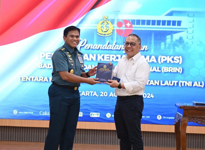 Papuanewsonline.com, Cilangkap - Sebagai tonggak penting dalam memperkuat sinergi antara dua lembaga yang memiliki peran krusial dalam menjaga kedaulatan dan kemajuan bangsa, TNI AL melaksanakan penandatanganan Perjanjian Kerja Sama (PKS) dengan Badan Riset dan Inovasi Nasional (BRIN).Penandatangan PKS ini dilaksanakan langsung oleh Kepala Staf Angkatan Laut (Kasal) Laksamana TNI Dr. Muhammad Ali dengan Kepala BRIN Dr. Laksana Tri Handoko, M.Sc. bertempat di Selasar Denma Mabesal, Cilangkap, Jakarta Timur. Selasa (20/08/2024).Kasal dalam sambutannya menyampaikan bahwa sebagai institusi militer yang bertugas menjaga kedaulatan dan keamanan negara di laut, TNI AL memiliki kapasitas dan kapabilitas untuk berkolaborasi serta bersinergi mendukung BRIN dalam menyelenggarakan kegiatannya di seluruh wilayah Perairan Indonesia.“Kolaborasi antara Badan Riset dan Inovasi Nasional dengan TNI Angkatan Laut, akan membuka peluang secara optimal dalam hal pemanfaatan dan optimalisasi data atau informasi riset dan inovasi, pemanfaatan bersama informasi geoportal, pemanfaatan sarana dan prasarana, peningkatan kapasitas Sumber Daya Manusia (SDM) serta publikasi dan diseminasi”, terang Kasal.Kasal berharap melalui PKS ini, akan terjalin kerja sama yang lebih erat dalam pengembangan riset dan teknologi yang mendukung kapasitas operasional TNI AL serta kemajuan inovasi di bidang pertahanan matra laut yang berkontribusi pada stabilitas dan kemajuan nasional.“Dengan adanya kerja sama ini, baik TNI AL maupun BRIN dapat saling melengkapi dan memperkuat peran masing-masing dalam menjaga kedaulatan dan keamanan laut Indonesia, serta memajukan inovasi dan teknologi nasional diantaranya peningkatan kapasitas teknologi dan riset, peningkatan keamanan dan kedaulatan maritim, pengembangan kapasitas Sumber Daya Manusia (SDM), efisiensi dan sinergi sumber daya, dan penguatan kedaulatan serta kepentingan nasional”, pesan Kasal. Kedatangan Kepala BRIN di Mabesal didampingi oleh Wakil Kepala BRIN Prof. Dr. Ir. Amarulla Octavian, S.T., M.Sc., DESD., ASEAN Eng., Sekretaris Utama BRIN Rr. Nur Tri Aries Suestiningtyas, M.A., Deputi Bidang Kebijakan Pembangunan BRIN Dr. Mego Pinandito, M.Eng., Direktur Kebijakan Politik, Hukum, Pertahanan, dan Keamanan BRIN Moch. Nurhasim, S.IP., M.Si., Direktur Pengelolaan Armada Kapal Riset Dr. Nugroho Dwi Hananto, M.Si., dan Kepala Biro Hukum dan Kerja Sama BRIN Mila Kencana, S.IP., M.A.Sementara itu, pejabat yang hadir dari TNI AL antara lain, Wakasal Laksamana Madya TNI Erwin S. Aldedharma, Pangkoarmada RI Laksamana Madya TNI Denih Hendrata, Komandan Pusat Hidro-Oseanografi Angkatan Laut (Danpushidrosal) Laksamana Madya TNI Dr. Budi Purwanto, serta Pejabat Utama Mabesal, dan Pejabat Kotama TNI AL. (PNO-12)
