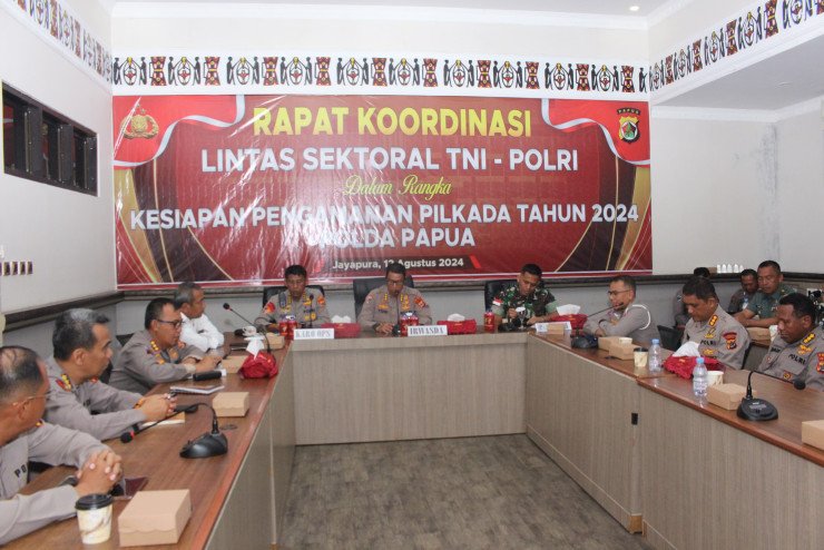 Papuanewsonline.com, Jayapura – Dalam rangka kesiapan pengamanan menuju Pilkada Serentak 2024 Polda Papua, Aparat gabungan TNI-Polri melaksanakan Rapat Koordinasi Lintas Sektoral, Senin (12/08).Kegiatan ini turut dihadiri oleh Irwasda Polda Papua, Kombes Pol. Drs. Yosi Muhamartha, Karo Ops Polda Papua I Ketut Gede Wijatmika, S.I.K., Asops Lantamal X Kol (P) Yustus Nasarius Rosi, Waasops Kasdam XVII/Cen Letkol Inf Arif Budi Situmeang, S.I.K., Para PJU Polda Papua serta tamu undangan TNI maupun Polri.Pelaksanaan Rapat Koordinasi ini berlangsung di Aula Cendrawasih Polda Papua, dan pada kesempatannya, Karo Ops Polda Papua menyampaikan terkait Operasi yang akan dilakukan.“Yth PJU dan para tamu undangan sekalian, saya akan jelaskan tentang Operasi yang akan kita laksanakan yaitu OMPC, OMPC I dalam rangka cipta kondisi yang pertama adalah KKR dan Tabligh Akbar dan itu merupakan pra Operasi yang sudah berjalan saat ini, sedangkan OMPC II pada dasarnya ada perjanjian antara TNI dan Polri Melalui MOU, rumus tugas pokok OMPC II sasarannya mulai dari ambang gangguan nyata dan harus kita perkiraan khusus oleh intelijen kita tuangkan sasarannya,” ujarnya.Lebih lanjut Ia menambahkan bahwa Wilayah Pegunungan Kombes Enoch untuk Kasatgas Papua Tengah Dirpamobvit, dan Kasatgas memiliki 7 Satgas, tugas Satgas Preventif berupa penggalangan kepada masyarakat, sedangkan untuk Preemtif yaitu Patroli pengamanan di TPS, Kemudian ada satgas Tindak dan Satgas Sus apabila ada gangguan dari kelompok KKB.“Dan berikutnya adalah Kasatgas Gakkum dan itu sudah yang kelima di Polda papua Induk itu dijabat oleh Dirkrimum, Beliau membawahi 2 sub satgas, yaitu satgas ciber yang terkait dengan berita berita hoax dengan menjelekkan salah satu paslon dan tentunya berkaitan dengan yang ada di media media sosial saja,” tambah Karo Ops Polda Papua.Pada kesempatan yang sama Dir Intelkam Polda Papua Kombes Pol. Wawan Setiawan, S.I.K., juga menyampaikan terkait tanggal 15 Agustus ini sementara sudah ada beberapa kabupaten yang sudah menyampaikan kegiatan aksi KNPB terkait dengan New York Agreement utk Korlap watpo wetipo dan Herlington balingga, dengan ajakan ajakan selebaran.“Beberapa kabupaten sudah terindikasi melaksanakan kegiatan seperti Kota Jayapura, Kabupaten Jayapura, Nabire, Jayawijaya, dogiyai, dan kobakma, dan Kekuatan massa dan perkembangan situasi akan sangat berpengaruh di lapangan,” ucap Dir Intelkam Polda Papua.Tidak lupa Irwasda Polda Papua juga mengingatkan agar Pilkada nnti pihak Kepolisian maupun TNI bisa mengantisipasi dan jangan sampai timbul lagi permasalahan yang kemarin timbul pada saat pemilu di wilayah Pegunungan.“Kemudian untuk bantuan TNI AD, AL, dan AU agar di salurkan berapa banyak yang bisa di siapkan untuk rencana kedepannya terkait Pam Pilkada tersebut,” tutup Irwasda Polda Papua. (PNO-12)