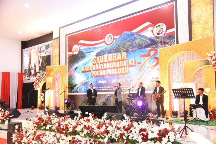 Papuanewsonline.com, Ambon - Puncak acara syukuran peringatan HUT ke-78 Bhayangkara yang digelar Polda Maluku di Gedung Plaza Presisi Manise, dimeriahkan oleh musisi dan seniman lokal dari provinsi Maluku.Pelibatan para seniman Maluku tersebut merupakan keinginan kuat Kapolda untuk memberdayakan potensi lokal yang dimiliki daerah ini. Mereka adalah soulcostic grup yang mengiringi acara, Mevy Pattikawa, penyanyi dan Nico Batbual penyanyi Sopran yang merupakan Mahasiswa UKIM semester akhir. Bahkan, atas talenta dan prestasi yang dimiliki tersebut, Nico Batbual kini direkrut sebagai honorer di Yanma Polda Maluku.Tak hanya itu, kemeriahan hari Bhayangkara tersebut juga diisi oleh Diva TNI dan Polwan Polda Maluku.Kapolda Maluku Irjen Pol Drs. Lotharia Latif SH., M.Hum mengatakan, Maluku kaya dengan para seniman dan musisi. Potensi tersebut harus diberdayakan, sebab bakay dan suara mereka tidak kalah dengan penyanyi-penyanyi nasional.Kepada PJ Gubernur Maluku sebagai Pimpinan daerah, Kapolda juga mengharapkan agar dapat memperhatikan bakat nyanyi yang dimiliki anak-anak di Maluku ini dengan membuat even nasional bahkan international sesuai julukan Ambon city of Music, biar Ambon semakin dikenal sebagai Centre of Gravity Music di Indonesia."Banyak anak-anak kita saat ini yang punya bakat nyanyi dan mereka punya suara yang cukup bagus. Mereka ini kiranya bisa diperhatikan sehingga kelak bisa menjadi calon penyanyi handal, kita harus mulai selalu tampilkan penyanyi lokal di event2 yang diselenggarakan oleh dinas dan buat even2 pencari bakat di Maluku ini," pintanya. (PNO-12)