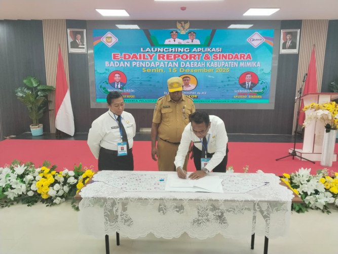 Papuanewsonline.com, Mimika — Badan Pendapatan Daerah (Bapenda) Kabupaten Mimika resmi meluncurkan dua aplikasi inovatif, yakni Sistem Pelaporan Kinerja Berbasis Elektronik (E-Daily Report) dan Sistem Integrasi Data dan Kinerja Pembangunan Daerah (SINDARA), pada Senin (15/12/2025). Peluncuran ini menjadi bagian dari upaya Bapenda dalam memperkuat tata kelola pemerintahan berbasis digital.