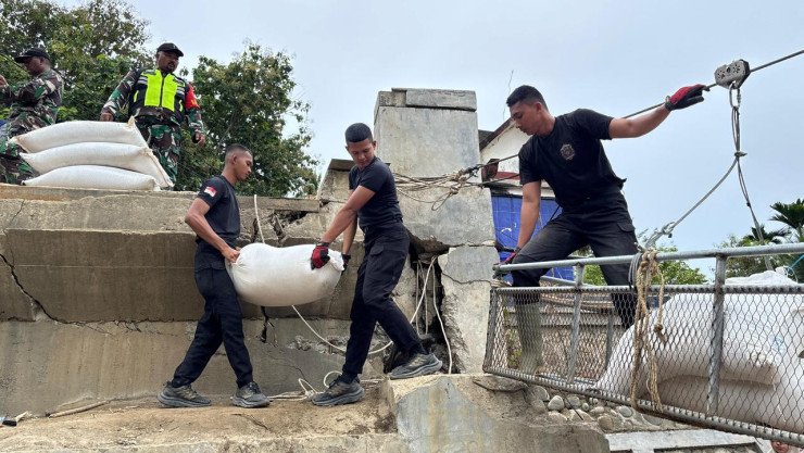 Papuanewsonline.com, Bireun - Personel SAR Satuan Brimob Polda Aceh membantu menyalurkan bantuan logistik untuk masyarakat terdampak bencana di Desa Kubu, Bireuen, dengan menggunakan jembatan Sling Baja.
