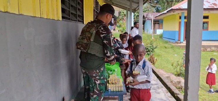 Papuanewsonline.com, Kaimana - Satgas pamtas kewilayahan Yonif 642/ kps, Pos Teluk Etna melaksanakan kegiatan berbagai makanan bergizi gratis di SD Negeri 1 Teluk Etna Kampung Kiruru, Distrik Teluk Etna, Kabupaten Kaimana, Papua Barat. (15/5)