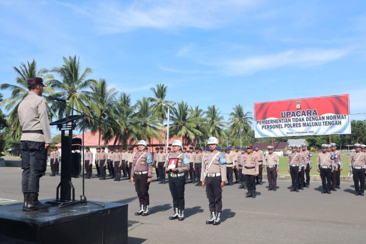 Papuanewsonline.com, Masohi - Kapolres Maluku Tengah, AKBP Hardi M K., S.I.K., M.H., pada Jumat, (14/11/2025) pagi memimpin upacara Pemberhentian Tidak Dengan Hormat (PTDH) terhadap IPTU J S. SOPLANTILA jabatan terakhir Kasubag Bin Ops Bag Ops Polres Maluku Tengah yang diberi sanksi tegas berupa PTDH atau pecat dari anggota Polri karena personel tersebut melanggar kode etik Polri.