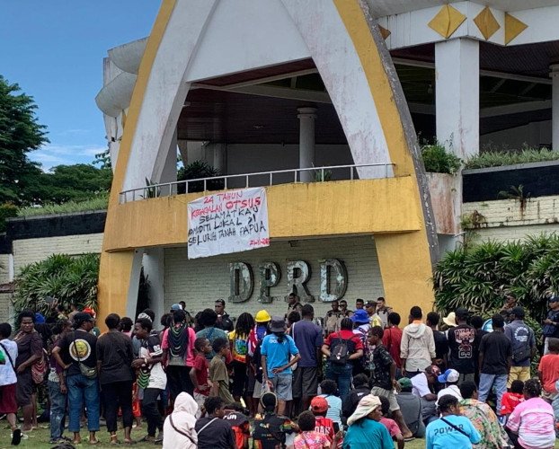 Sejumlah mahasiswa, pelajar, dan masyarakat menggelar aksi unjuk rasa di kantor DPRK Mimika untuk memperingati 24 tahun berjalannya Otonomi Khusus (Otsus) di Papua