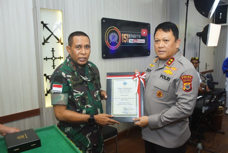 Papuanewsonline.com, Ambon - Kepala Kepolisian Daerah Maluku, Irjen Pol Drs. Eddy Sumitro Tambunan, M.Si, diangkat sebagai warga kehormatan Korem 151/Binaiya saat memenuhi undangan podcast di Markas Korem 151/Binaiya, Kota Ambon, Kamis (5/9/2024).