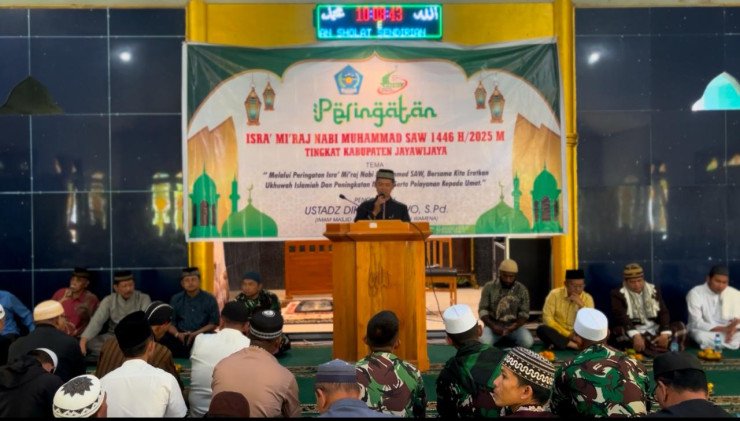 Papuanewsonline.com, Jayawijaya - Personel Pos Kotis Walesi Satgas Pamtas RI-PNG Yonif 641/Bru bersama masyarakat Papua menggelar peringatan Isra Mi’raj Nabi Muhammad SAW 1446 H tingkat Kabupaten Jayawijaya yang dilaksanakan di Masjid Al-Aqsa Distrik Walesi, Kabupaten Jayawijaya, Provinsi Papua Pegunungan. (27/01/2025).