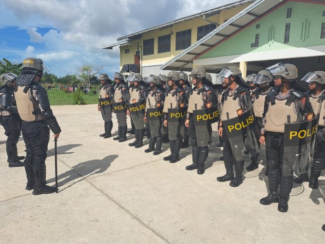 Papuanewsonline.com, Merauke - Personel Polda Papua melalui Subsatgas Unras Satgas Preventif Operasi Mantap Praja Cartenz (OMPC) II 2024 Wilayah Papua Selatan melakukan pergelaran peralatan pendukung dalam pelaksanaan tugas Pengendalian Massa (Dalmas) bertempat di halaman Vertenten Merauke, Kamis (5/12).