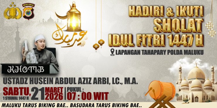 Polda Maluku mengajak masyarakat untuk bersama-sama menghadiri dan melaksanakan sholat Idul Fitri di Lapangan Tahapary dalam suasana yang khidmat dan penuh kebersamaan.