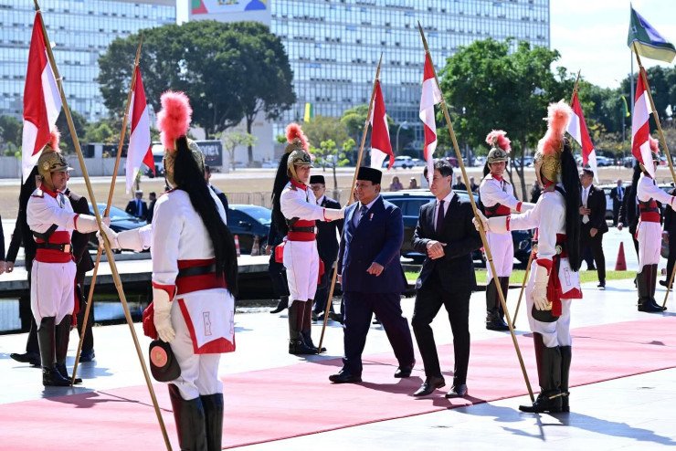 Suasana khidmat dan penuh kehormatan terasa di Istana Planalto, Brasilia ketika Presiden RI Prabowo Subianto melakukan kunjungan kenegaraan ke Brasil, Rabu (09/07/2025).