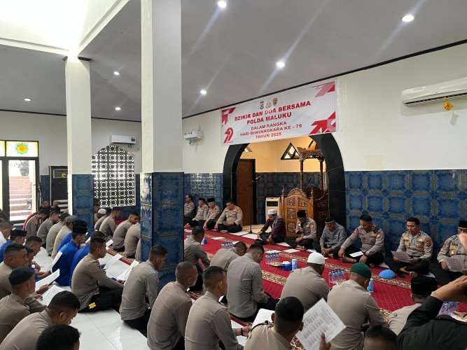 Papuanewsonline.com, Ambon - Menjelang HUT ke-79 Bhayangkara, Kepolisian Daerah Maluku menggelar kegiatan dzikir dan doa bersama sebagai bentuk rasa syukur kepada Allah SWT, Tuhan Yang Maha Kuasa.