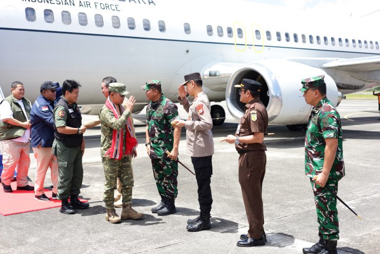 Suasana penyambutan berlangsung hangat dan penuh keakraban, mencerminkan soliditas antara TNI, Polri, dan pemerintah daerah dalam mendukung kebijakan nasional.
