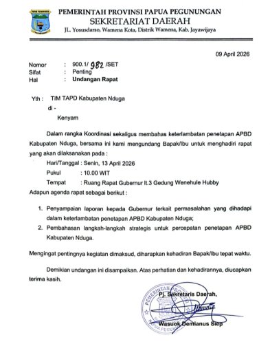 Pemerintah Provinsi Papua Pegunungan menjadwalkan rapat strategis bersama jajaran terkait untuk membahas keterlambatan penetapan APBD Kabupaten Nduga